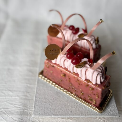ホワイトチョコムースの中にフランボワーズのムースとジュレを忍ばせました。