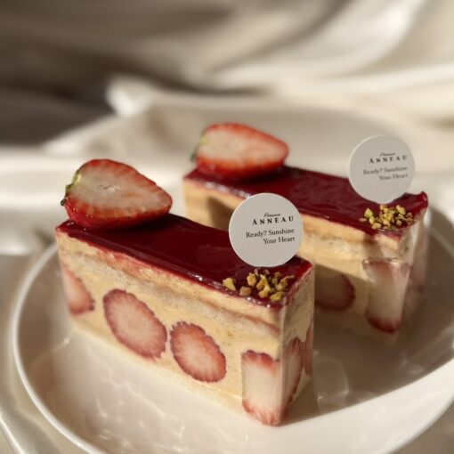 ピスタチオとバニラのムースリーヌの中に、フレッシュの苺をたくさん敷き詰めてダックワーズでサンドしました。上にはフランボワーズのジャムを。季節のお味を召し上がれ。