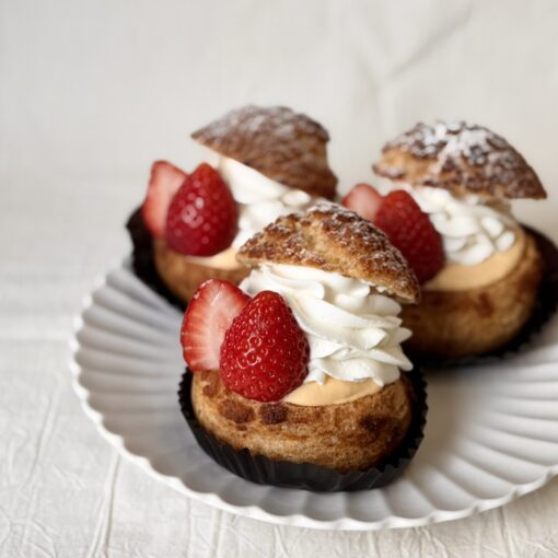 アノー自慢のシュークリームに、ベリージャムとカスタードクリームを絞り、苺風味の生クリーム&苺を飾りました。