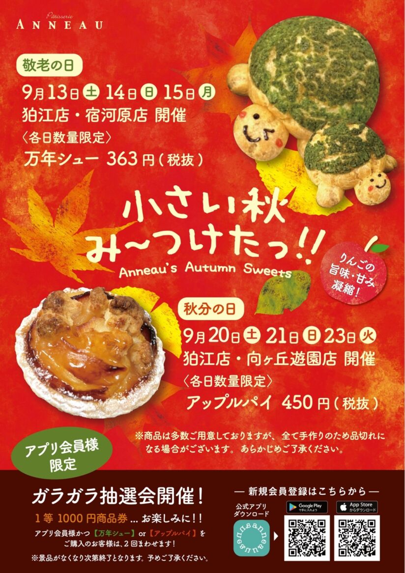 9月は、敬老の日と秋分の日にイベントを開催!敬老の日にはかわいいかめの形をしたシュークリーム『万年シュー』を販売。秋分の日には、秋の味覚りんごをたっぷり使ったアノー自慢のアップルパイを販売いたします。ぜひご利用くださいませ!